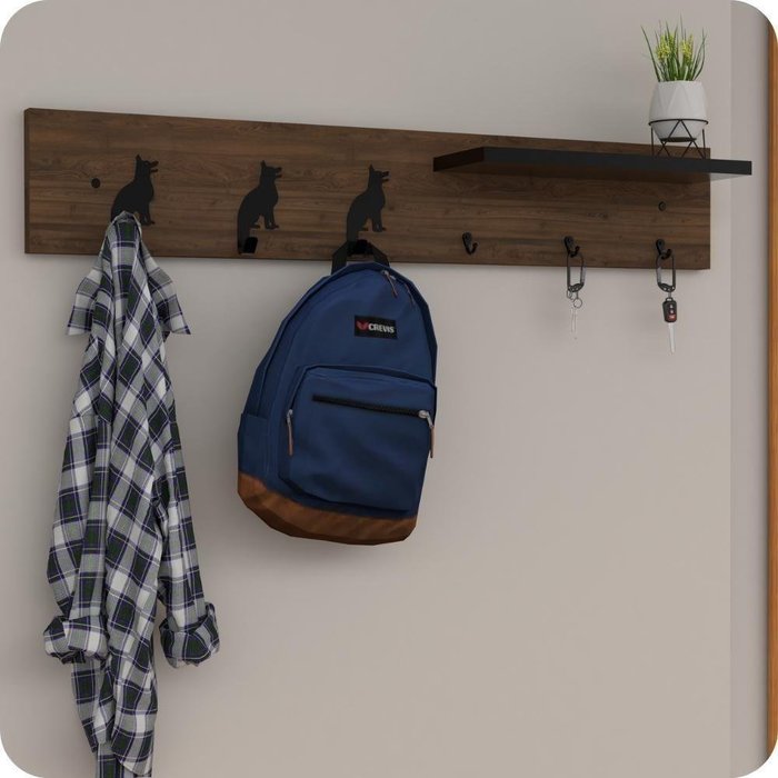 Ninguém gosta de perder a chave, não é mesmo?O Porta Chaves além de organização, também proporciona mais sofisticação para sua casa com seu design moderno e exclusivo.Além das chaves, também é possível guardar outros objetos como blusas, bonés, carteira, celular ou decorar com vaso de plantas ou porta-retratos. O Design minimalista é uma tendência que chegou para ficar!O Porta Chaves Cabideiro de Parede une o design moderno e minimalista com boa qualidade de acabamento. Os ganchos de aço proporcionam mais resistência e segurança para armazenar seus objetos preferidos.O gancho no formato de Cachorro faz com que seu ambiente fique alegre e com muita personalidade, dando um toque especial no seu lar. BENEFÍCIOSDesign exclusivos dos ganchos de CachorroGanchos pet de aço com corte preciso feito à laser de última geraçãoRecorte das bordas com extrema precisãoMadeira com espessura de 15mm (1,5cm)Durabilidade maior devido a resistência dos materiais utilizadosAcompanha acabamento para esconder a cabeça dos parafusos de fixaçãoMaior resistência de peso nos ganchos de CachorroNível de instalação: FácilModo de instalar: Parafusar os ganchos na madeira, furar a parede e parafusar o porta chaves na parede. ESPECIFICAÇÕES TÉCNICASMaterial: MadeiraMaterial dos Ganchos de Cachorro: Aço 1020Material dos Ganchos Menores: Metal ZamacCor da Base: MarromCor da Prateleira: PretoCor/Acabamento dos Ganchos: Pintura Eletrostática Epóxi Preto Fosco Largura: 60cmAltura: 10cmEspessura: 1,5cmLargura da Prateleira: 10cmComprimento da Prateleira: 25cmEspessura da prateleira: 1,5cm CONTEÚDO DA EMBALAGEM1 Porta chaves com prateleira3 Ganchos comuns3 Ganchos no formato de CachorroParafusos e Buchas *OBS: Os objetos decorativos não acompanham o produto.