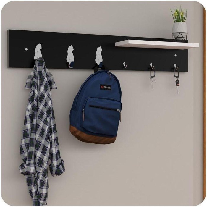 Ninguém gosta de perder a chave, não é mesmo?O Porta Chaves além de organização, também proporciona mais sofisticação para sua casa com seu design moderno e exclusivo.Além das chaves, também é possível guardar outros objetos como blusas, bonés, carteira, celular ou decorar com vaso de plantas ou porta-retratos. O Design minimalista é uma tendência que chegou para ficar!O Porta Chaves Cabideiro de Parede une o design moderno e minimalista com boa qualidade de acabamento. Os ganchos de aço proporcionam mais resistência e segurança para armazenar seus objetos preferidos.O gancho no formato de Gato faz com que seu ambiente fique alegre e com muita personalidade, dando um toque especial no seu lar. BENEFÍCIOSDesign exclusivos dos ganchos de GatoGanchos pet de aço com corte preciso feito à laser de última geraçãoRecorte das bordas com extrema precisãoMadeira com espessura de 15mm (1,5cm)Durabilidade maior devido a resistência dos materiais utilizadosAcompanha acabamento para esconder a cabeça dos parafusos de fixaçãoMaior resistência de peso nos ganchos de GatoNível de instalação: FácilModo de instalar: Parafusar os ganchos na madeira, furar a parede e parafusar o porta chaves na parede. ESPECIFICAÇÕES TÉCNICASMaterial: MadeiraMaterial dos Ganchos de Gato: Aço 1020Material dos Ganchos Menores: Metal ZamacCor da Base: PretoCor da Prateleira: BrancoCor/Acabamento dos Ganchos: Cromado Largura: 60cmAltura: 10cmEspessura: 1,5cmLargura da Prateleira: 10cmComprimento da Prateleira: 25cmEspessura da prateleira: 1,5cm CONTEÚDO DA EMBALAGEM1 Porta chaves com prateleira3 Ganchos comuns3 Ganchos no formato de GatoParafusos e Buchas *OBS: Os objetos decorativos não acompanham o produto.