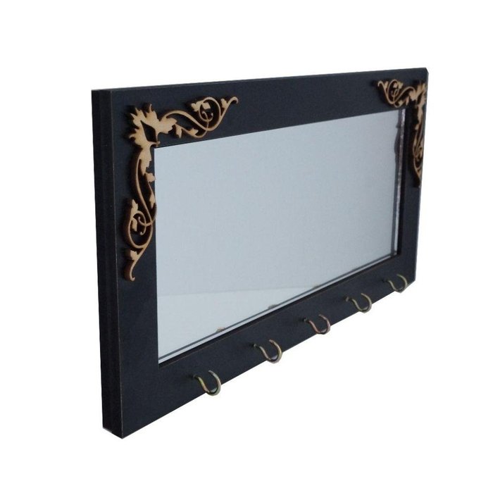 Quadro Porta Chaves em MDF preto e arabescos amadeirados. Com espelho e 5 ganchinhos.