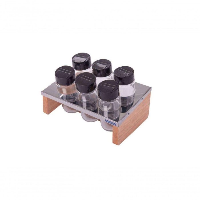 PORTA CONDIMENTOS 6 PEÇAS ESSENCE*Porta condimento feito em madeira e aço inox com seis compartimentos. *Seis vidros para condimentos com tampa incluso.