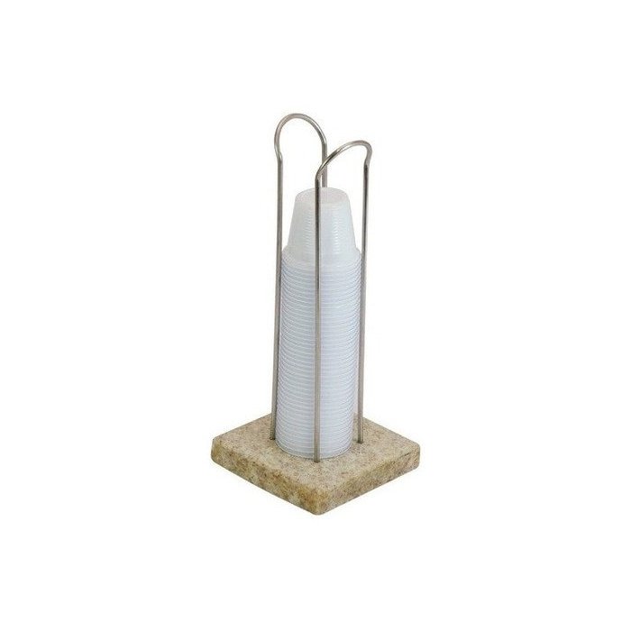 Dispenser de mesa portátil para copo de café 50mL.Suporte com base de granito (cores sortidas), hastes laterais confeccionadas em arame de aço inox que mantém os copos organizados.Capacidade: 60 copos (Aproximadamente)Medidas: 245mm (altura) x 100mm (largura) x 100mm (profundidade)