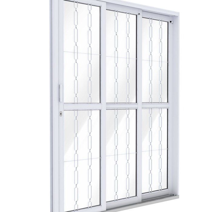 Possui duas folhas móveis e uma fixa, com grade mosaico que valoriza o visual do ambiente sem abrir mão da proteção. O vidro liso de 0,4cm permite ampla entrada de luz natural, garantindo leveza e conforto visual.