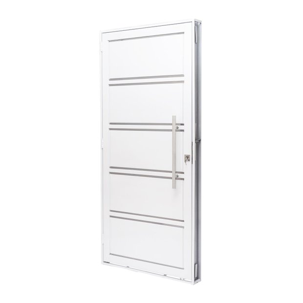 Porta de Aço Lambri 215x100cm com Friso e Puxador Inox Batente 12cm Qualitysol Ramassol Branco