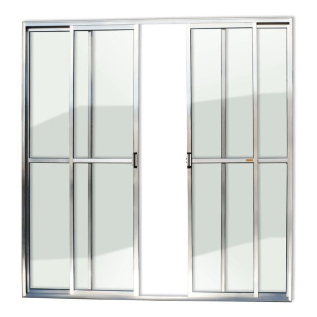 Porta Balcão 4 Folhas de Alumínio Linha Super 25 Anodizado Brilhante 2 Folhas Fixas e 2 Folhas Móveis Vidro Liso Incolor 3mm Com Trinco Altura 210 Cm Largura 200 Cm Requadro 7,8 Cm Garantia de 5 anos contra defeitos de fabricação