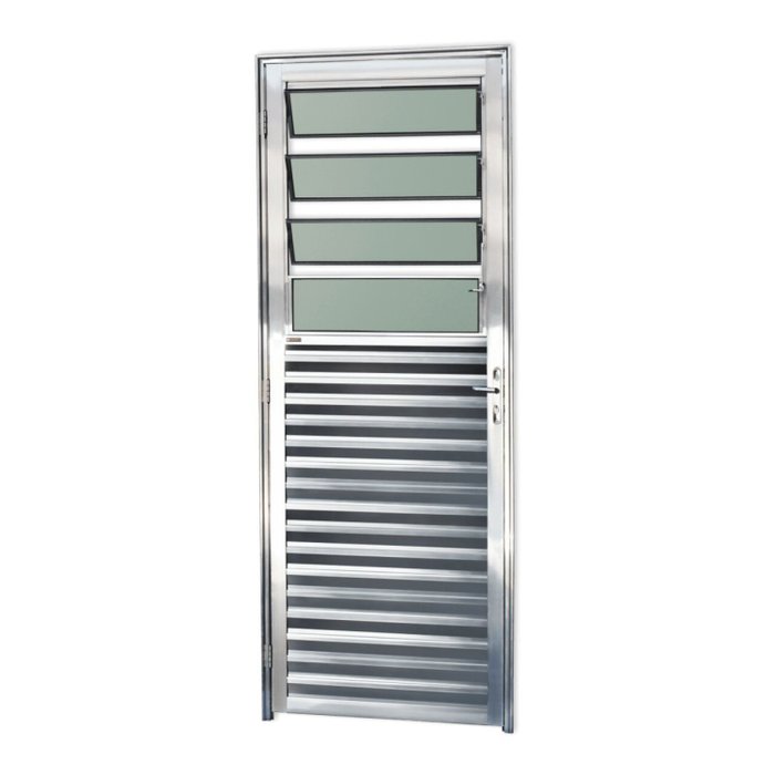 Portas de Abrir de Alumínio Linha L.25 Anodizado Brilhante 1 Folha de Abrir para o Lado Direito Vidro Mini Boreal 4mm Fechamento tipo Veneziana na parte Inferior Fechadura e Dobradiças na Cor do Produto Altura 210 Cm Largura 80 Cm Requadro 4,6 Cm Garantia de 5 anos contra defeitos de fabricação