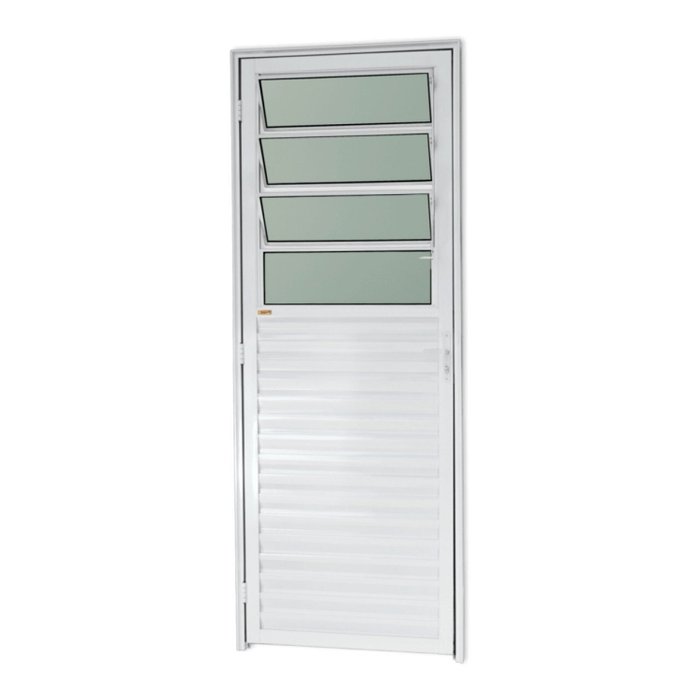 Portas de Abrir de Alumínio Linha L.25 Pintura Eletrostática Branca 1 Folha de Abrir para o Lado Direito Vidro Mini Boreal 4mm Fechamento tipo Veneziana na parte Inferior Fechadura e Dobradiças na Cor do Produto Altura 210 Cm Largura 80 Cm Requadro 4,6 Cm Garantia de 5 anos contra defeitos de fabricação