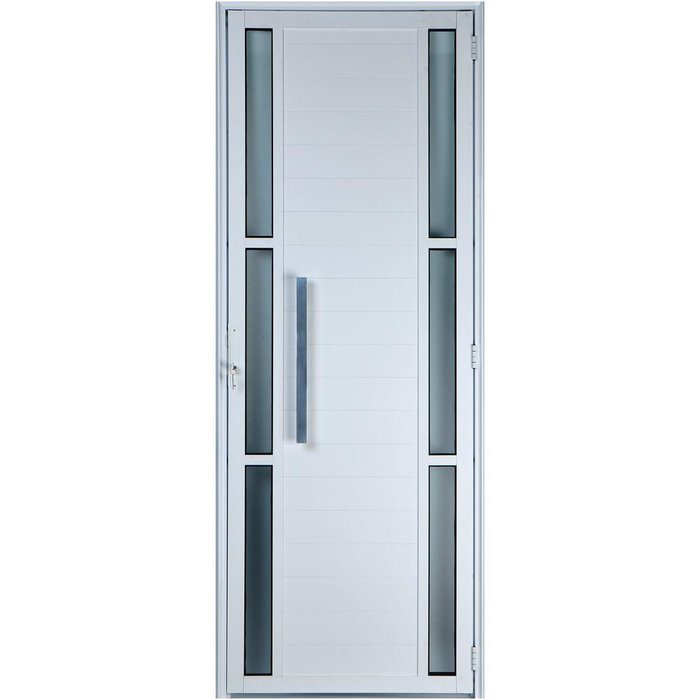 Porta De Alumínio Lambril Com Visor Duplo Com Puxador 2,10 X 0,90 Esquerda Linha All Soft Cor Branco PORTA LAMBRIL COM VISOR LATERAL DUPLO COM PUXADOR As Portas Lambril Com Visor Duplo + Puxador, traz para a sua casa Segurança, um Design Sofisticado e Iluminação. Dando a opção aos nossos clientes de uma porta reforçada por conta do seu perfil em alumínio Duplo. Com seu sistema de fechadura Rolete, traz ao ambiente segurança e facilidade ao fechar a porta, uma vez que basta encosta-la para o seu sistema rolete “trancar” a porta. Com o seus Visores Laterais traz iluminação e um toque de Elegância para o ambiente.São indicadas para diversos ambientes como: entradas, corredores, salas, e etc. Com sua pintura especial eletroestática (Epóxi), garantem um brilho por muito mais tempo que outros materiais. Especificações TécnicasPorta Lambril Com Visor Duplo e Puxador de Aluminio de Abrir (Giro).Altura Total Produto: 210 Centímetros.Largura Total Produto: 90 Centímetros.Espessura Total do Produto: 4,5 Centímetros.Pintura Eletrostática Branca (Epóxi).Modelo e Espessura do Vidro: Vidro Mini Boreal de 3,5mm – Vidros Laterais.Modelo de abertura: 1 Folha de Abrir (Giro).Opções de lado de Abertura: Direita ou Esquerda.Contêm: 1 Folha de Abrir (Giro) – Par de Chaves – Fechadura Rolete – Puxador.Conteúdo: Perfis de Alumínio (Lambril Duplo – Reforçado), Batentes, Ferragens, Dobradiças e Acessórios.Produto Pronto para Instalar (Acabado e Montado) Fácil Instalação.Fabricante: Fabricação Própria (Desde 2004 no mercado).Local indicado: Ambiente Interno e Externo - Residencial e Comercial.Produto Normatizado (ABNT).Produto com Alta Durabilidade.Embalagem de Proteção Incluso.Garantia contra defeitos de fabricação.