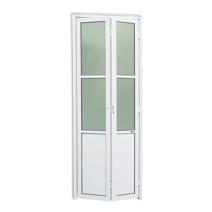 Portas de Abrir de Alumínio Linha L.25 Pintura Eletrostática Branca 2 Folhas de Sanfonar para o Lado Esquerdo Vidro Mini Boreal 4mm Lambris Horizontais na parte Inferior Trinco e Dobradiças na Cor do Produto Altura 210 Cm Largura 80 Cm Requadro 4,6 Cm Garantia de 5 anos contra defeitos de fabricação