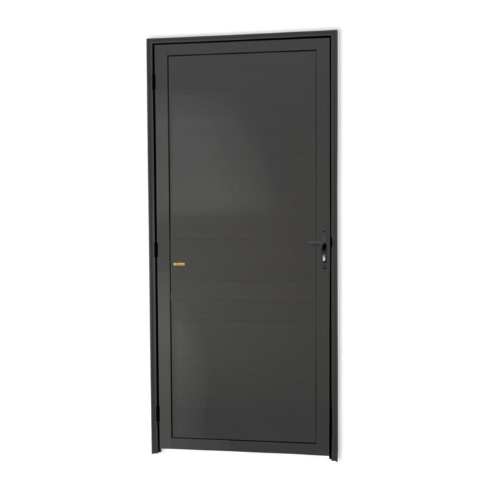 Portas de Abrir de Alumínio Linha Super 25 Pintura Eletrostática Cinza 1 Folha de Abrir para o Lado Direito Lambris Horizontais Fechadura e Dobradiças na Cor Preta Altura 210 Cm Largura 70 Cm Requadro 4,6 Cm Garantia de 5 anos contra defeitos de fabricação