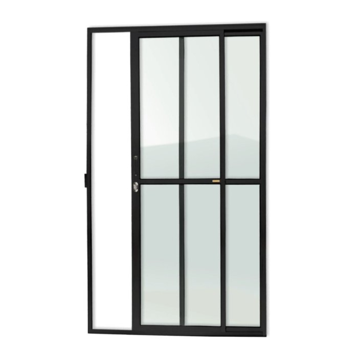 Porta de Correr 2 Folhas de Alumínio Linha Super 25 Pintura Eletrostática Preta 1 Folha Fixa e 1 Folha Móvel Vidro Liso Incolor 3mm Com Fechadura Altura 210 Cm Largura 150 Cm Requadro 7,8 Cm Garantia de 5 anos contra defeitos de fabricação
