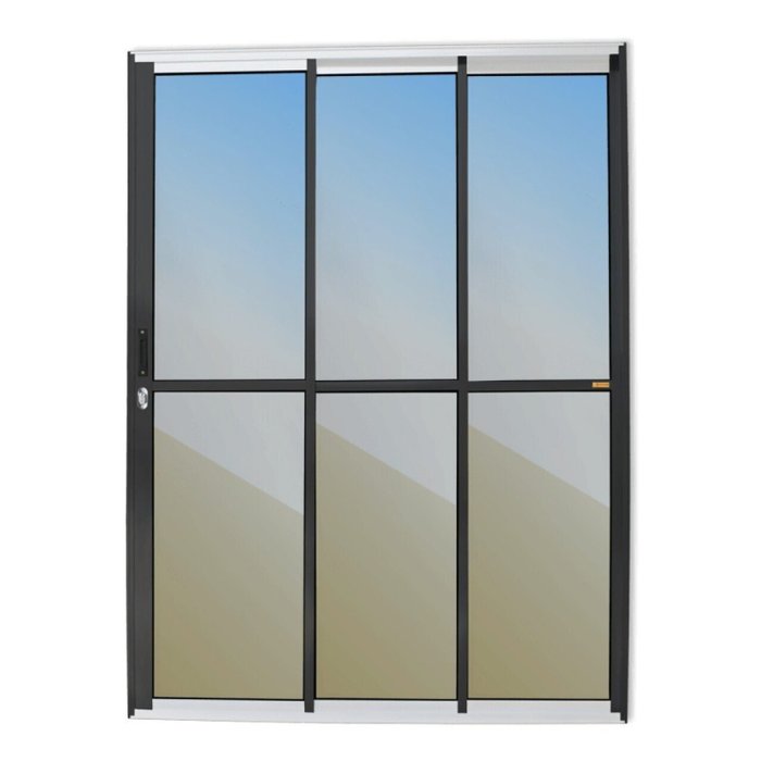 Porta de Correr 3 Folhas 1/3 de Alumínio Linha Super 25 Pintura Eletrostática Mix Preta 1 Folha Fixa e 2 Folhas Móveis Vidro Reflex Champanhe 3mm Com Fechadura Altura 210 Cm Largura 180 Cm Requadro 11,5 Cm Garantia de 5 anos contra defeitos de fabricação