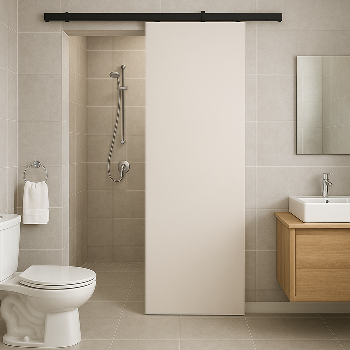 A porta de correr branca com kit aparente combina funcionalidade e estilo em um design contemporâneo.