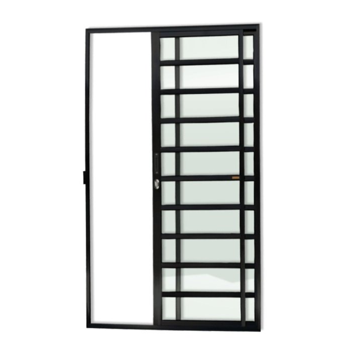 Porta de Correr 2 Folhas de Alumínio Linha Super 25 Pintura Eletrostática Preta 1 Folha Fixa e 1 Folha Móvel Vidro Liso Incolor 3mm Travessas e Vidros Horizontais Com Fechadura Altura 210 Cm Largura 150 Cm Requadro 7,8 Cm Garantia de 5 anos contra defeitos de fabricação