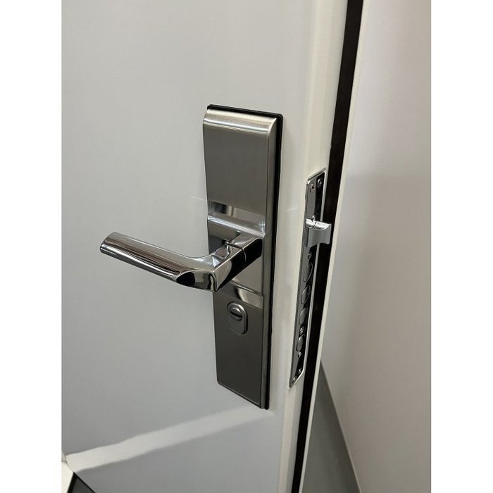 Porta de Segurança para instalação no Lado Direito confeccionada em chapa de aço tratada quimicamente; pintura eletrostática na cor branca; equipada com fechadura mecânica com chave padrão Multiponto com amamento externo e interno em aço inoxidável; fornecida com 7 chaves; 9 travas de segurança, sendo 3 superiores, 4 centrais e 2 inferiores; 4 dobradiças invisíveis em aço; olho mágico; dupla fita de espuma para redução de ruídos