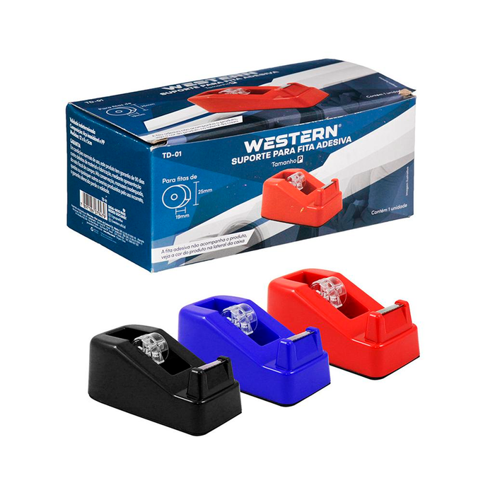 - Contém:- 1 Suporte para fita adesiva: 12 x 6 x 5cm (CxLxA)- Dimensões da Embalagem: 12,5 x 6,5 x 5cm (CxLxA)- Quantidade Master: 60 Peças- Dimensões Master: 40,3 x 26,1 x 29,1cm (CxLxA)- Material: Aço inoxidável e Plástico (Polipropileno)- Cor: Sortimento Azul, Preto e Vermelho- Observação:- Este item é comercializado em cores sortidas: Azul, Preto, Vermelho.- O Mix de cor é variável e na entrega você pode receber 1, 2, ou 3 cores.- Tipo de Embalagem: Caixa litografada- Marca: Western- Origem: China- Características:- Para fitas de até 19mm de largura e rolos de Ø25mm;- Fita adesiva não inclusa.- Indicação:- Escritório;- Escola;- Residência;- Expedição;- Comércio.- Antes de usar:- Verificar se o produto está em perfeita condições de uso.- Advertência/Atenção.- Mantenha fora do alcance das crianças.- Guarde em local seguro.