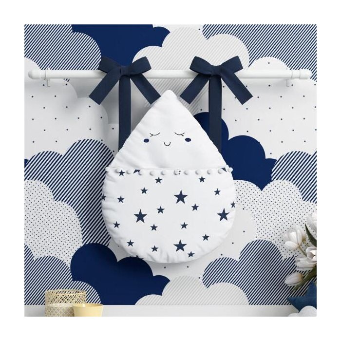 O Porta Fraldas Varão Gotinha com Pompom Azul Marinho deixa as fraldinhas sempre à mão na hora da troca, além de decorar o quarto de bebê nuvem com a delicadeza do tecido 80% Algodão / 20% Poliéster e dos tons suaves. Estrelinhas e pompons decoram o acessório.