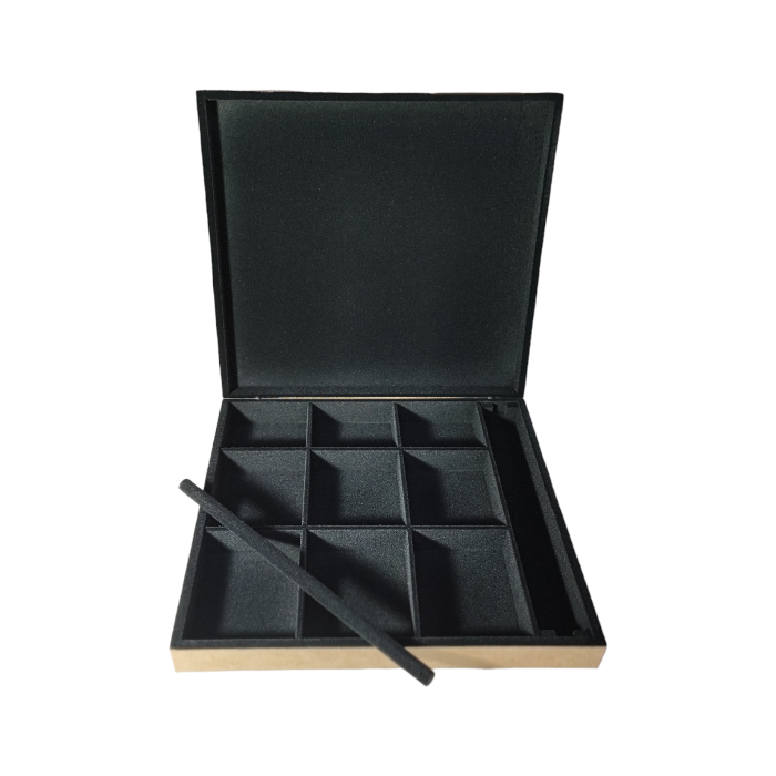 Porta Joia e Biju com 09 Divisões e Aneleira, é confeccionado em MDF de ótima qualidade, com interior revestido através da técnica de flocagem em preto, trazendo proteção, organização e requinte a suas Joias e Bijus. Caixa com dobradiça de pino quase invisível.