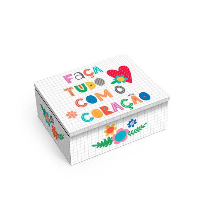 O Porta-Joias Frases Coloridas Pequeno é lindíssimo! Perfeito para combinar com outros mimos da mesma coleção e decorar seu quarto com muito charme e personalidade. Super fofo, este porta-jóias tem estampa da frase: “Faça tudo com o coração” com letras coloridas em fundo branco quadriculado. Simplesmente maravilhoso! O Porta-Joias Frases Coloridas Pequeno é feito em MDF, com acabamento externo em papel couchê e acabamento interno com papel camurça. Ideal para guardar jóias, bijus, acessórios de cabelo e o que mais você precisar. Especificações: - Porta-Joias Frases Coloridas Pequeno; - Material: MDF revestido com papel couchê; - Perfeito para guardar acessórios como anéis, colares e pulseiras. Dimensões (A x L x P): - 5,5 x 14 x 11 cm.