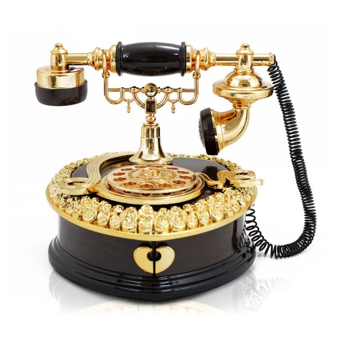 Caixa musical com sistema de corda. Executa movimentos similares a de um telefone