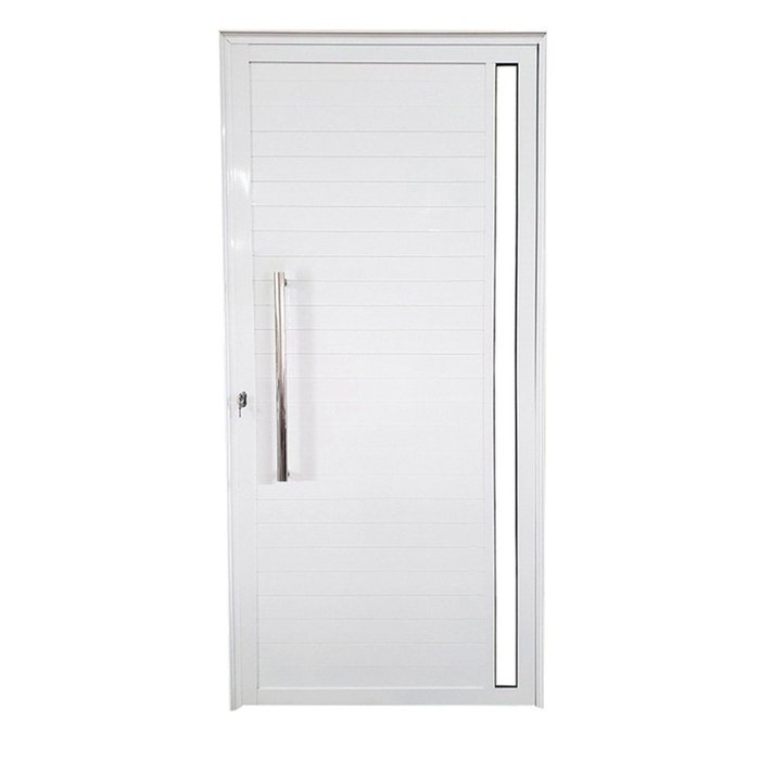 Design Moderno e Iluminação Natural Com um visual clean na cor branca, a porta possui um visor lateral em vidro incolor, que permite a entrada de luz natural sem abrir mão da privacidade. O destaque fica por conta do puxador em aço inox, que adiciona um toque de requinte e modernidade, contrastando elegantemente com o alumínio branco. Seu acabamento semi-brilho facilita a limpeza e mantém a aparência de nova por muito mais tempo.