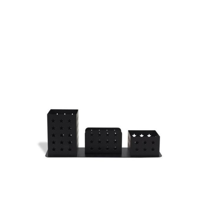 Esse incrível Porta Caneta Preto Básico Triplo, feito em metal possui pequenos recortes de estrelas, sendo básico e prático, combinando com qualquer ambiente.