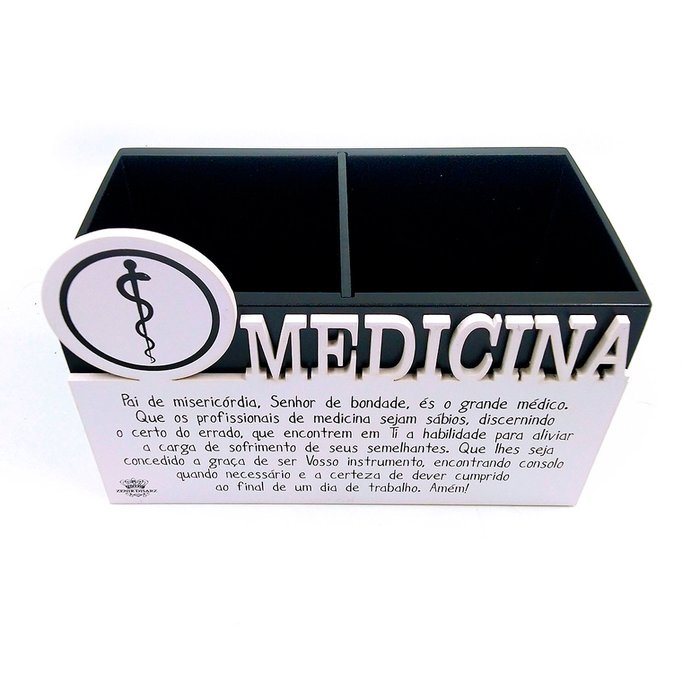Nada mais legal do que presentear aquele amigo(a) com algo da profissão! Esse porta-lápis medicina está bacana, com uma linda oração! Material MDF Cor Preto e Branco Dimensões 11,5x16,10cm Peso Líquido 273g Instruções de Uso Não molhar; Limpar com pano seco; Não utilizar produtos químicos ou abrasivos; Impactos podem danificar o produto.