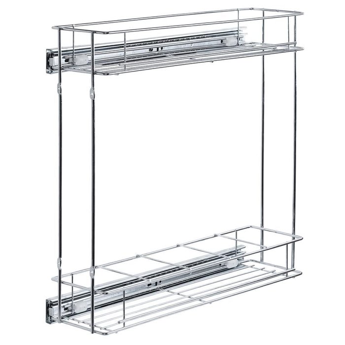 Porta Latas/Óleos Lateral Light Produto confeccionado em Aço Inox. Acompanha trilhos telescópicos Inox, que vão desmontados da peça e insumos para a fixação dos mesmos. Perfeito para nichos em cozinhas com instalação lateral. Arame 4mm e corrediças Light com fixação direita ou esquerda. Acabamento brilhante. Medidas totais: 140x425x475mm Código: 7207- Cromado