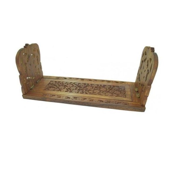 Porta livros retrátil de madeira entalhada.