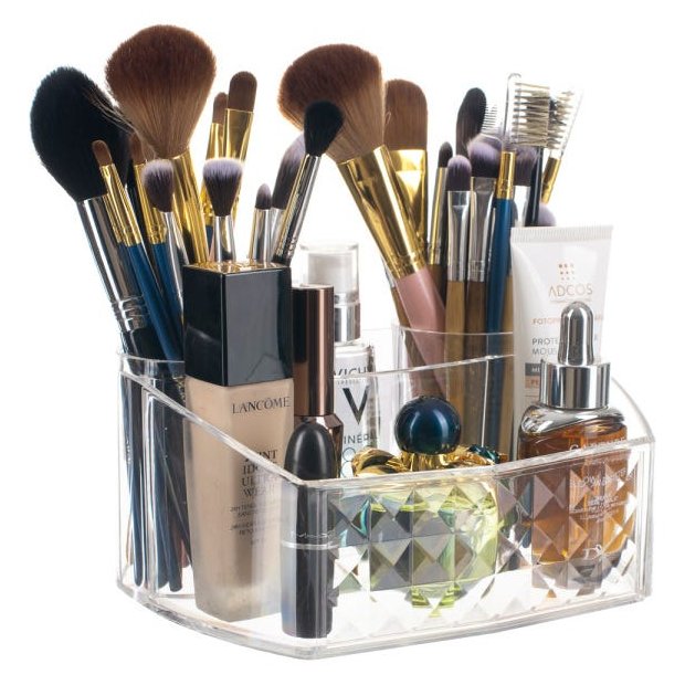Um lindo organizador que não pode faltar na sua bancada, penteadeira, banheiro. Com 4 divisórias de tamanhos variados pode acomodar produtos como maquiagem, pincel, cosméticos, perfumes, escova de cabelo, pode ser utilizado também na mesa do escritório como porta lápis.