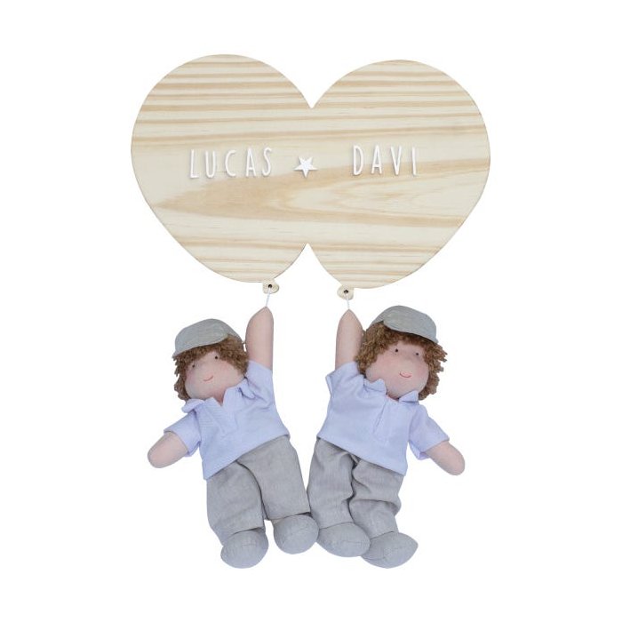 Enfeite em formato de duas bexigas feito em madeira MDF pintada, o nome dos bebês em acrílico fixado na plaquinha e decorado com bonecos de tecido com roupinhas.