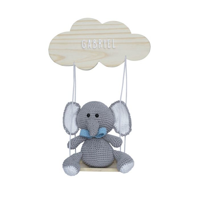 Enfeite em formato de nuvem com balança feito em madeira pinus encerada, o nome do bebê em acrílico fixado na plaquinha e decorado com elefante de gravatinha amigurumi de croche.