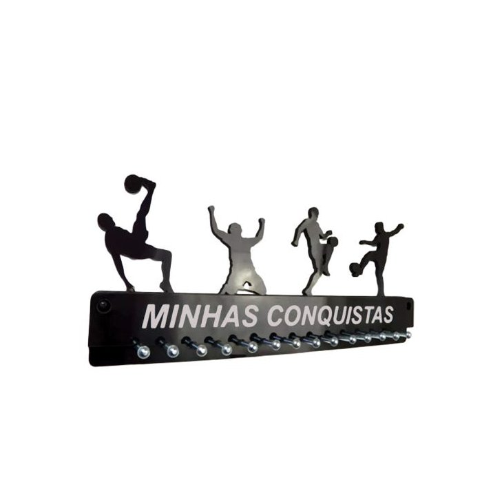 PORTA MEDALHAS POSSUI 14 SUPORTES DE FERRO MACIÇO tratado com acabamento superficial de zinco.Para a capacidade MÁXIMA do porta medalhas (50 medalhas) devem ser colocadas mais de uma medalha por suporte!!!_______________________________________________________________Cada medalha conquistada é a prova de sua superação, é a prova de que cada minuto de treino, de que cada gota de suor derramado valeu a pena. É justo deixar essas medalhas dentro de uma caixa ou dentro de uma gaveta? É justo não mostrar o quanto cada medalha significa para você? As pessoas precisam saber o quanto você é esforçado e o quanto esse esforço está melhorando sua qualidade de vida! E com certeza você vai incentivar seus entes queridos e amigos a seguirem seus passos!!!Por isso estamos aqui!! Para te oferecer um local atraente e organizado para que todos vejam suas conquistas, suas medalhas, seu orgulho;______________________________________________________________ESPECIFICAÇÕES TÉCNICASO Porta Medalhas é feito de madeira (mdf com acabamento superficial liso e brilhante de alto padrão);O Porta Medalhas é laqueado (superfície perfeitamente lisa e brilhante);O Porta Medalhas tem pintura na cor exclusiva PRETA;O Porta Medalhas desse anúncio tem um adesivo de vinil recortado em plotter digital colado exatamente conforme a foto do anúncio - MINHAS CONQUISTAS com adesivo na cor cinza (exatamente conforme a foto do anúncio), infelizmente não há possibilidade de personalização ou alteração das cores do adesivo; temos outras opções de adesivos dessa mesma modalidade esportiva em outros anúncios dessa mesma seção;O Porta Medalhas é cortado à laser de CO2 de alta precisão;Tamanho/dimensões: 34cm de comprimento x 14cm de altura;Espessura: 6mm;Peso: 350g