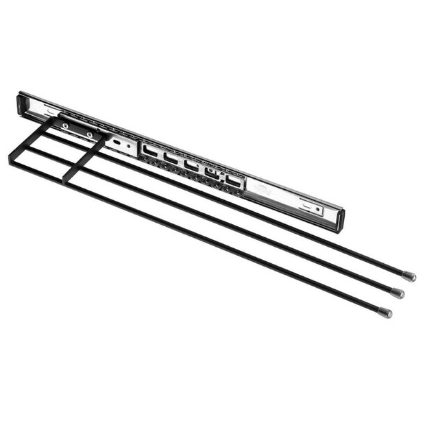 Porta Pano de Prato Triplo Suporte para Cozinha de Armário Deslizante de Corrediça Preto.<br><br>Garantia: 90 dias / Peso: 598g / Cor predominante: preto / Ref: 7898187739249<br>Dimensões do porta pano de prato: 44,5cm (C) x 3,5cm (L) x 9,5cm (A);<br>Dimensões das corrediças: 40,5cm (C) x 3,3cm (L) x 1,5cm (A);<br>Dimensões das hastes: 44,5cm (C) x 1cm (L) x 8,5cm (A);<br>Dimensões mínimas para o módulo de instalação: 46cm (C) x 10cm (L) x 3,5cm (A);<br>Curso de abertura: 44,5cm;<br>Distância entre as hastes: 2,7cm;<br>Cuidados: Não lavar com materiais abrasivos;<br>Material: aço pintado;<br>Comporta: 3 toalhas.<br><br>Limpeza e cuidados:<br>- Não utilizar materiais abrasivos;<br>- Higienizar com esponja macia e sabão neutro, secar em seguida.<br><br>Este suporte para pano de prato preto deslizante possui três hastes para acomodar as toalhas. De material resistente, você pode fixar dentro do armário, otimizando espaço e mantendo as toalhas sempre estendidas para arejarem, evitando assim que fiquem úmidas por cima dos seus móveis. O porta pano de prato é um item indispensável em sua cozinha e melhor ainda se for deslizante, deixando as toalhas ao seu alcance de forma sofisticada.