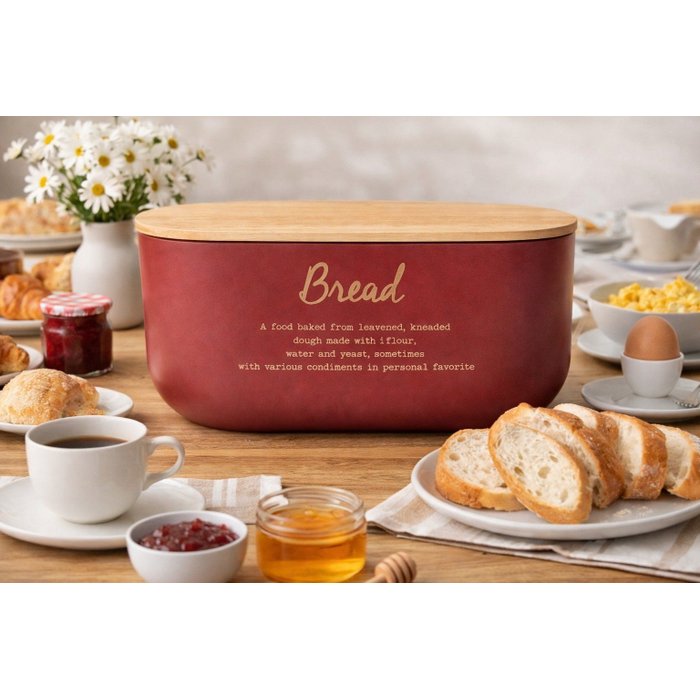 A estrutura em metal resistente garante durabilidade no uso diário, enquanto a tampa em bambu com excelente vedação ajuda a preservar a textura e o frescor dos alimentos por mais tempo. O tom vermelho carmim adiciona personalidade e sofisticação à bancada, tornando o porta pão um verdadeiro destaque decorativo. Perfeito para quem valoriza detalhes que fazem a diferença.