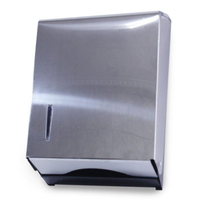 Dispenser de papel toalha ou toalheiro em aço inox, com excelente qualidade e alto luxo com design sofisticado e com estrutura reforçada para ambiente público, com trava de segurança com chave. Indicado para ambientes como, hospitais, consultórios, restaurantes, clínicas, industrias, shoppings, hotéis, vestiários, e para outros ambientes. Com capacidade para 500 folhas de 2 ou 3 dobras, sem porta cadeado. Pintura epóxi.