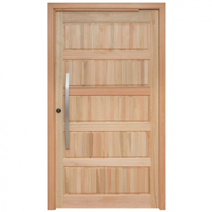 Porta pivotante de almofadas. Composta por: 1 folha de porta, marco, guarnições para um lado, dobradiças pivotantes, fechadura e puxador. Marco simples. Folha de porta de 1,20m. Fechadura Alavanca Stam. Peitoril removível, para instalação sobre o piso, reduzindo em 3 cm a altura do marco (de 2,17 passa para 2,14). Produto pronto para instalação.