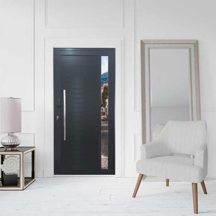 Porta Pivotante de Alumínio Preto Com Puxador, Visor e Fechadura Digital Linha 30 - Bergamo
