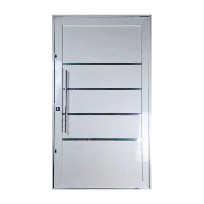 Porta Pivotante de Alumínio São praticamente um novo elemento decorativo para a Casa. Sua principal característica é o tipo de abertura, que já não acontece através das conhecidas dobradiças instaladas em uma das laterais, mas, sim, através de um Pivô (eixo central). Este pivô se fixa no batente da porta e no chão, fazendo com que uma pequena parte da porta seja projetada para fora e é isso que dá o ar intrigante, curioso e muito Elegante. Lambris duplo na cor Branca junto com Frisos Brilhantes Horizontais realçam a beleza e modernidade do Produto. Perfil Linha 30mm robusto (considerado um dos melhores perfis do mercado) e Kit com Chave Rolete e duas Chaves Tetras reforçam a segurança do Lar. Completa com todos os acessórios e componentes para utilização. Especificações Técnicas Portas de Alumínio de Abrir (Pivotante). Altura Total do Produto : 220 Centímetros
