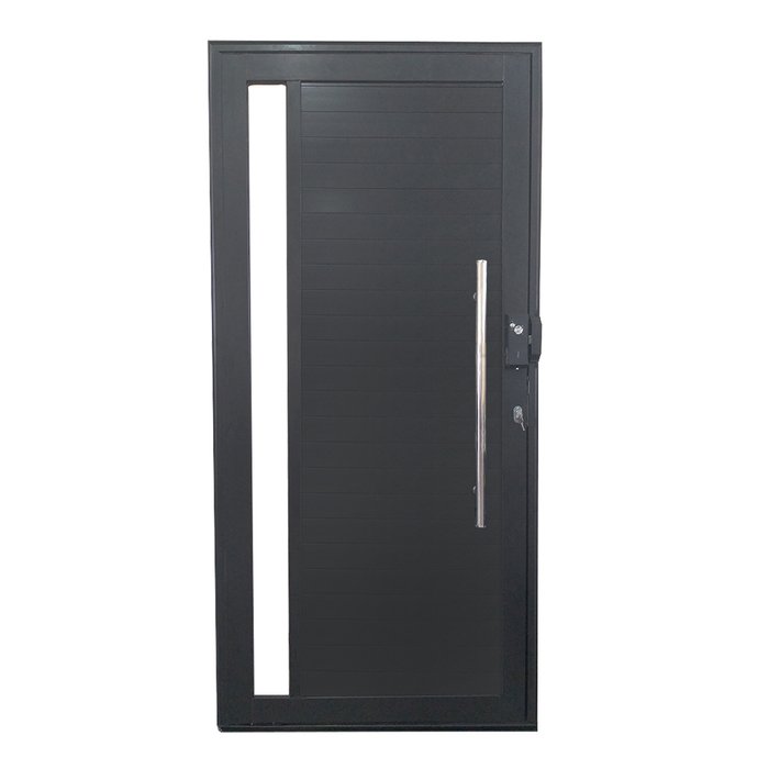 Fabricada em alumínio e revestida com pintura eletrostática preta, a porta de Alumínio Pivotante com Puxador e Visor Com Fechadura Digital, vem sendo muito usada por ser muito resistente e por ter uma vida útil duradoura além de ter uma aparência futurista.