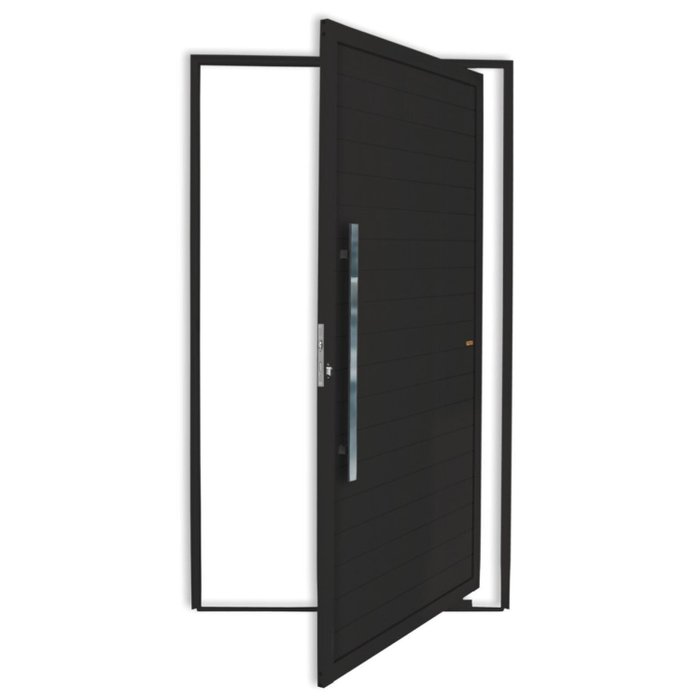 Porta Pivotante de Alumínio Linha Super 25 Pintura Eletrostática Preta 1 Folha de Abrir para o Lado Esquerdo Lambris Horizontais Puxador Milão 80 Cm Polido Altura 210 Cm Largura 100 Cm Requadro 4,6 Cm Garantia de 5 anos contra defeitos de fabricação