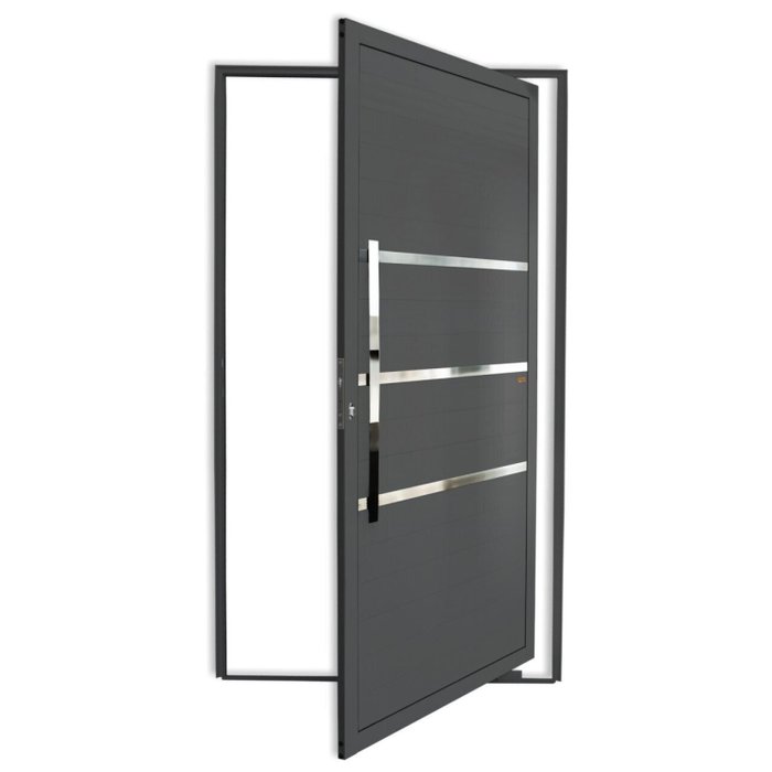 Porta Pivotante de Alumínio Linha Super 25 Pintura Eletrostática Cinza 1 Folha de Abrir para o Lado Esquerdo Lambris Horizontais 3 Frisos Polidos e Envernizados Puxador Dubai 80 Cm Polido Altura 210 Cm Largura 120 Cm Requadro 4,6 Cm Garantia de 5 anos contra defeitos de fabricação