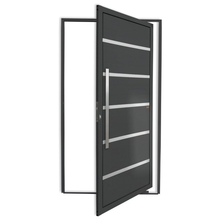 Porta Pivotante de Alumínio Linha Super 25 Pintura Eletrostática Cinza 1 Folha de Abrir para o Lado Esquerdo Lambris Horizontais 5 Frisos Escovados Puxador Dubai 80 Cm Escovado Altura 210 Cm Largura 100 Cm Requadro 4,6 Cm Garantia de 5 anos contra defeitos de fabricação