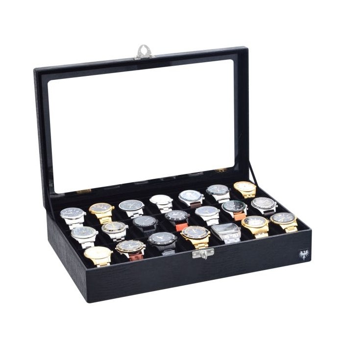Porta Relógio Total Luxo Couro Ecológico 21 Nichos Preto e Preto