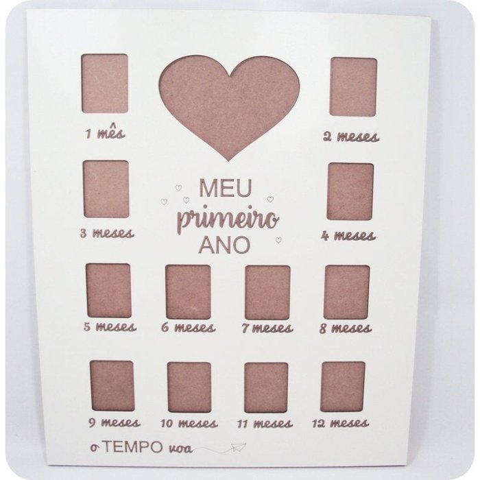 Lindo porta retrato para 12 fotos, acompanhamento do primeiro ano do bebê são 12 fotos 6x5 e no coração uma foto 10x15. É cortado em mdf branco e os escritos são gravados na peça, o verso é em mdf cru conforme foto.
