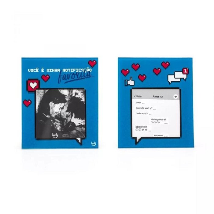 DESCRIÇÃO DO PRODUTO "Minha notificação favorita é você" Que tal uma mensagem assim para presentear o seu amor, principalmente se ele ou ela gosta de estar sempre em conexão com a web, as mídias sociais ou os jogos de videogame? Uma boa pedida! Afinal, este porta-retrato é duplo, ou seja, vale a foto do casal em poses apaixonadas, divertidas ou sérias. É só deixar a criatividade rolar! Para 2 fotos 10x10cm. CARACTERÍSTICAS DO PRODUTO Largura: 13 cm Altura: 15.5 cm Comprimento: 3 cm Capacidade: 2 FOTOS 10X10 CM Profundidade: 1 cm Matéria-prima: Vidro IMPORTANTE SABER Contém 2 porta-retratos. Limpar com pano seco. Teme químicos e abrasivos.