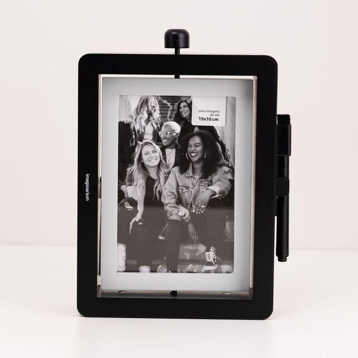 Apresentando um modelo que já é um hit por aqui, só que agora numa versão repaginada na cor preta, mas ainda trazendo o seu shape giratório e 1 caneta marcadora, essa belezinha é o porta-retrato ideal para você colocar duas fotos de tamanho 10 cm x 15 cm e anotar recadinhos especiais!