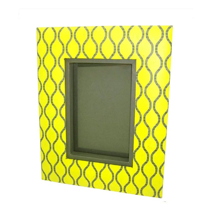 Este porta-retrato é muito versátil podendo ser utilizando para decorar mesas. Possui design moderno que combina com diferentes ambientes de decoração. Sua elegância, permite que possa ser colocado no ambiente desejado, dando vida nova ao ambiente. Produzido na cor amarela com detalhes em verde e com estampa de papel.