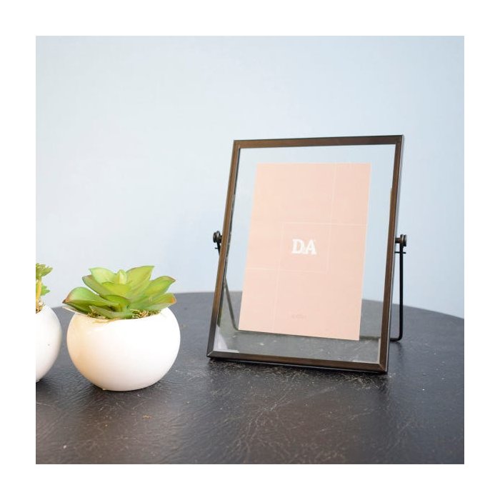 Porta-Retratos de Metal e Vidro na Cor Preto Fosco para fotos 10x15cm verticais.