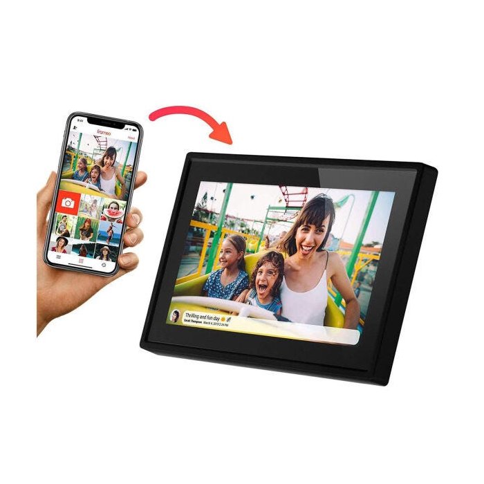• Fácil de usar, basta baixar no Smartphone o aplicativo gratuito Frameo para iOS ou Android e enviar em segundos a foto ou o vídeo para o Porta-retratos digital.