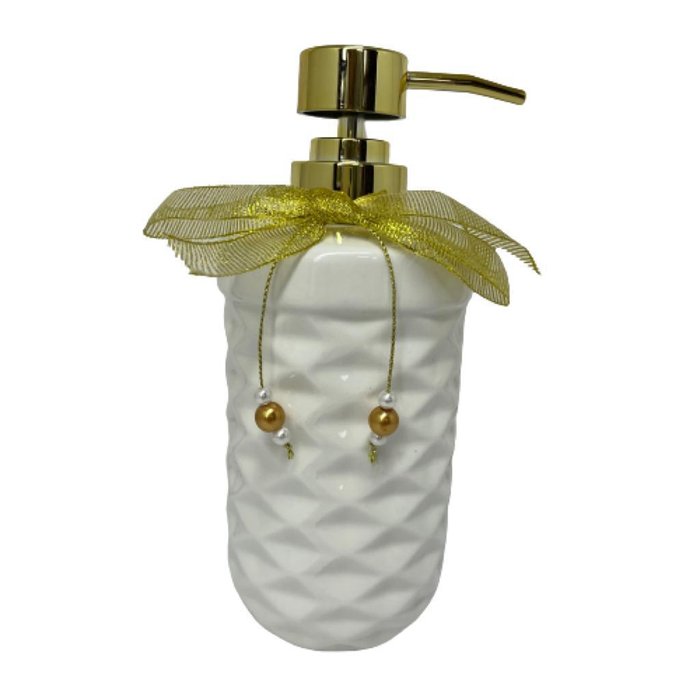 Porta sabonete líquido branco de cerâmica com trabalhado e detalhe laço dourado.